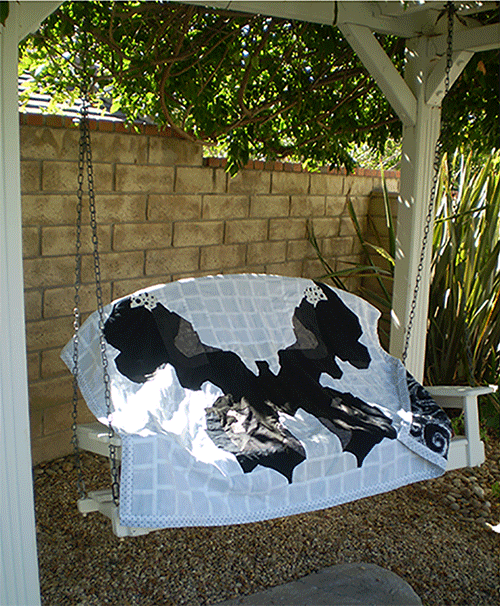 The fabrics used in the butterfly were from leftover scraps of grey and black fabrics, while the white background was mostly new fabric. The butterfly is not appliquéd onto the white background fabric – it has been patchworked together. Many of the 3″x3″ quilt squares had to be custom made, since the overall shape of the butterfly is organic, to mimic an ink blot design. To finish the quilt, I hand stitched around the outline of the butterfly.