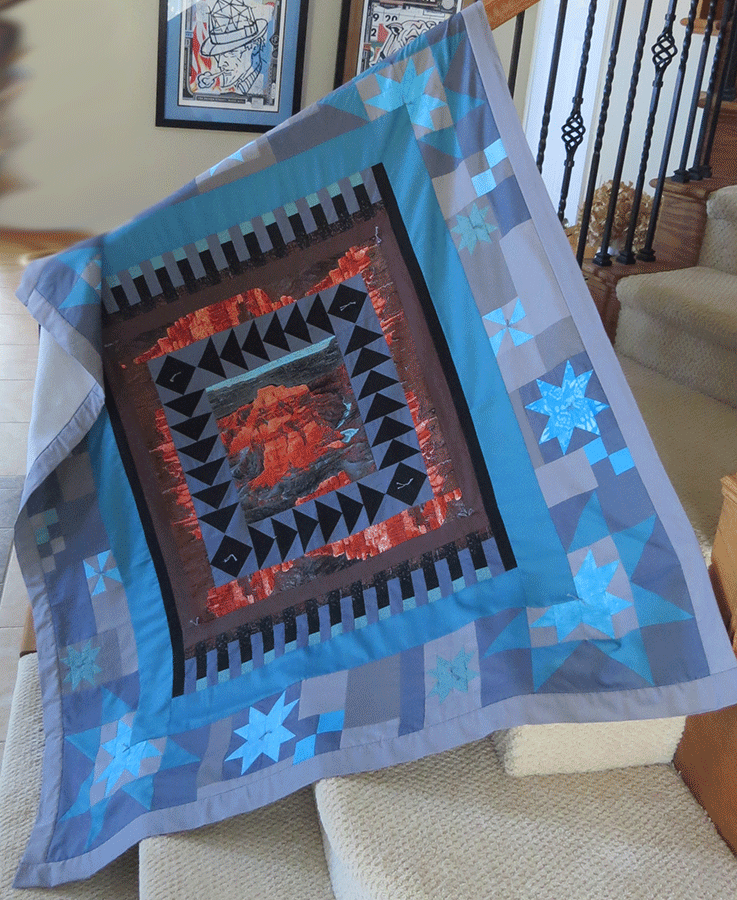 The Grand Canyon-like center for this medallion quilt was fabric I had gotten from my Granny. My guess is it is circa 1970’s. It has sat in my stash for years, challenging me to do something with it. Its colors are so intense that every time I went past it, I just kept on going!