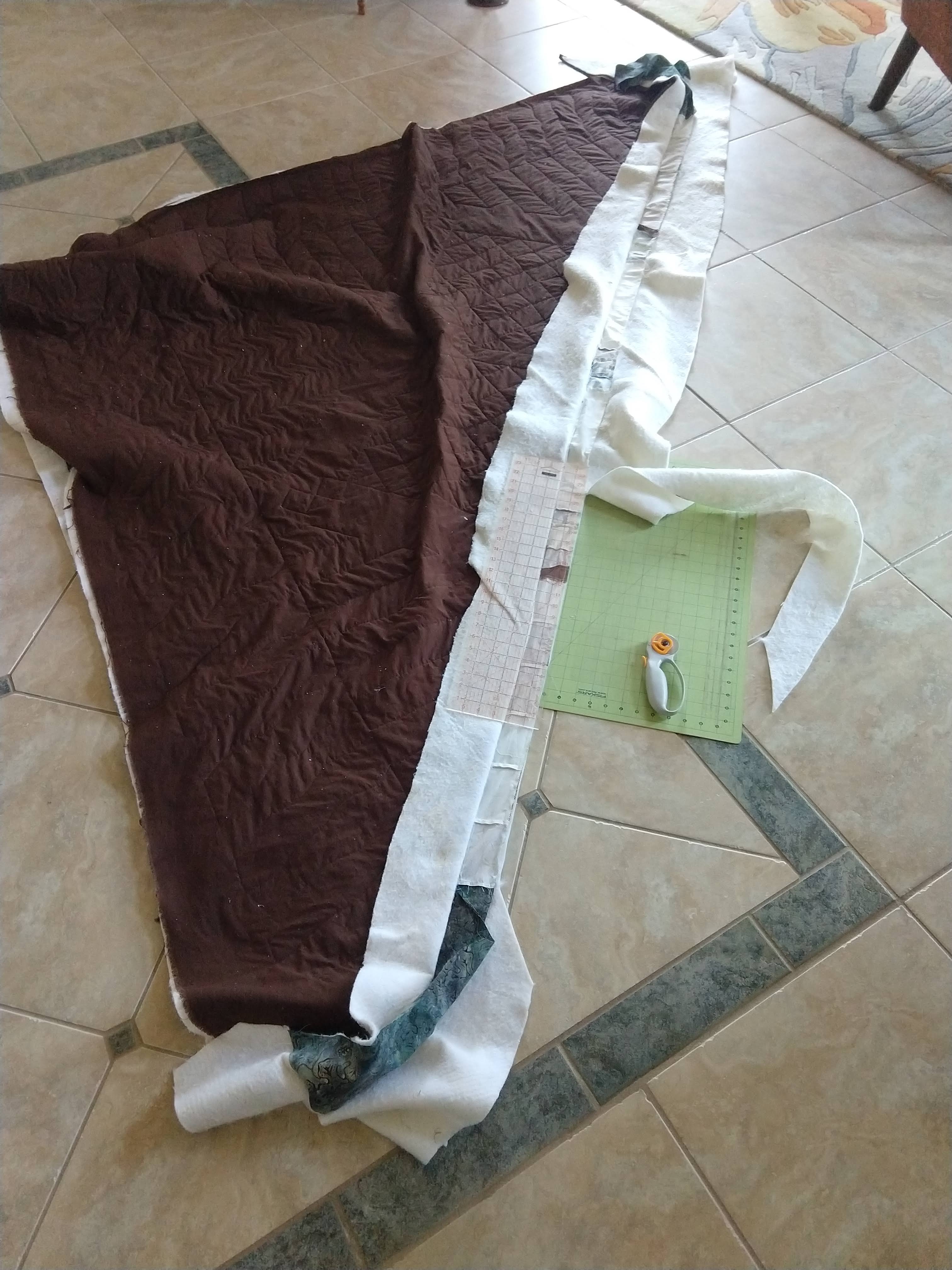 This recent finish is the largest quilt I’ve made, measuring 90″x90″. I quilted it on my regular sewing machine, and because I didn’t want to wrestle the entire thing during the quilting phase, I opted to build it in two triangles that I then joined after quilting – sort of quilt as you go (QAYG), but on a much larger scale. I had a few lines I had to quilt on the machine after it was all together, but this seemed more manageable than having to do all the quilting at its completed size. Due to its size, I had to do a lot of the final trimming, pinning, etc. on my entryway floor, as my sewing room does not have enough space for something this large to be laid flat and still work around it. I sewed the front seam by machine, and then hand sewed the batting and back seam.
