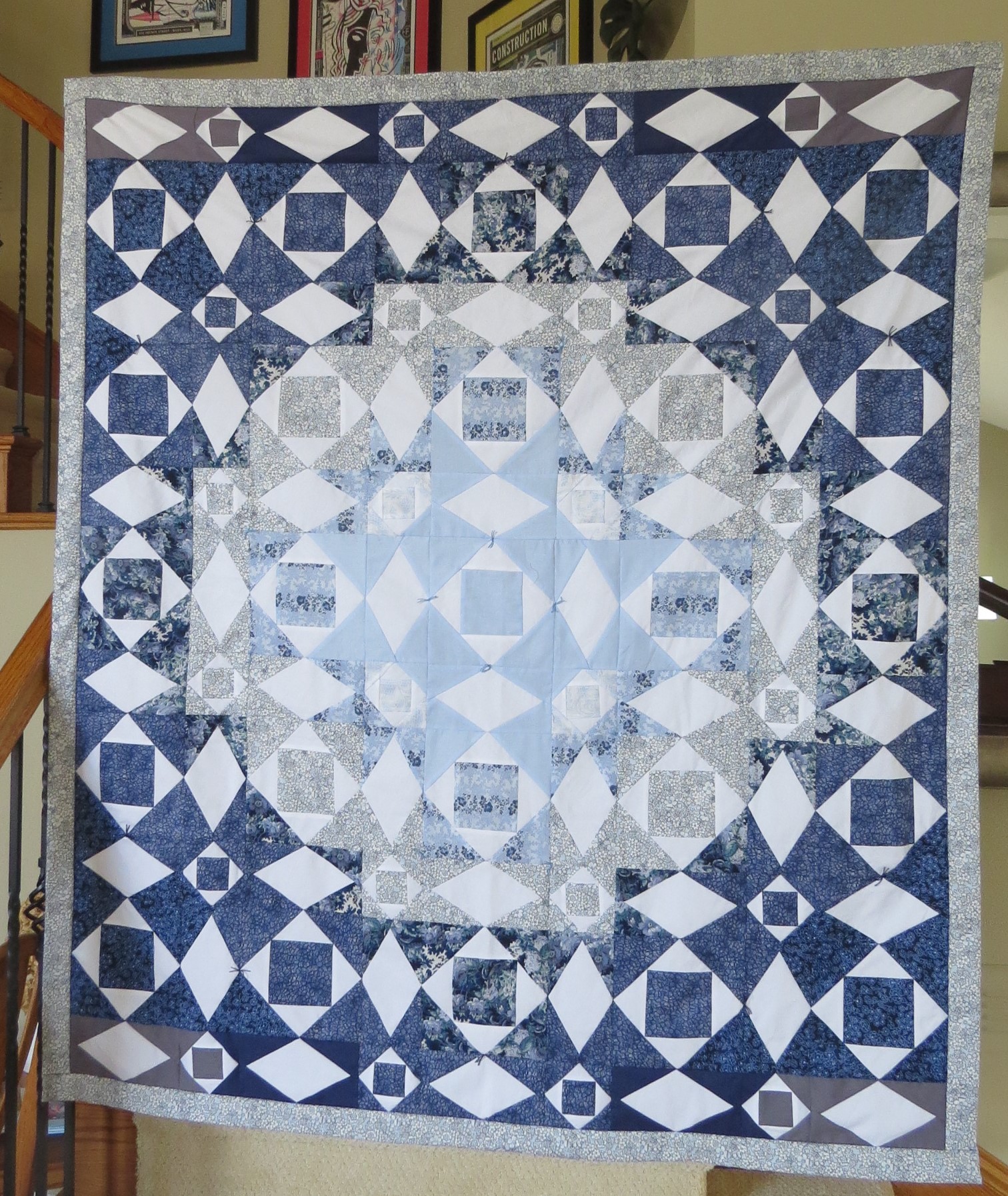 After sitting in a drawer for a year, I decided that a finished quilt was better than a perfect quilt, and substituted a dark solid blue fabric, seen in the top and bottom rows. The piece of past fabric in this quilt is the first band of the darker blue fabric. It was some that my sister gave me several years ago, previously a favored sundress of hers. I have used it in several quilts, and the dress is now whittled down to a just a few remaining small scraps. I made this as a quanket, finishing it with fleece backing.