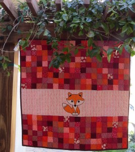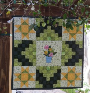 The backing fabric, shown here, is a Mary Engelbreit design from 2001, and has been living in my stash for about ten years now. I think the fabric is super cute, but every time I considered using it in a quilt, I was not sure how to cut the fabric. The individual elements are so close to one another, that I was concerned that even fussy cutting it would lose too many aspects of the overall design. I finally figured that using it as a backing on a baby quilt was going to do it the most justice. The piecing on the front mainly uses scraps and small pieces from my stash, and the flower pot is done using a raw-edge appliqué technique.