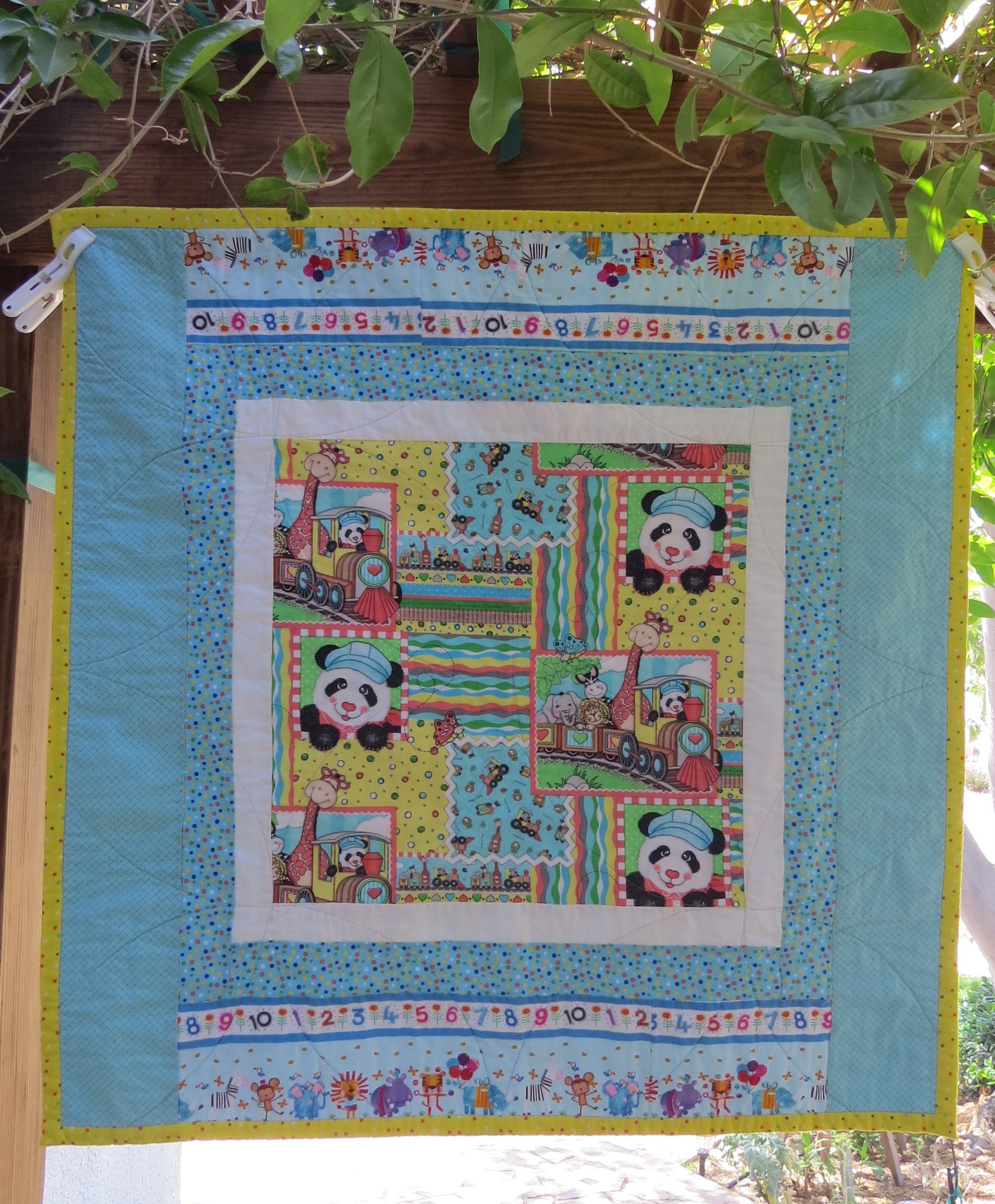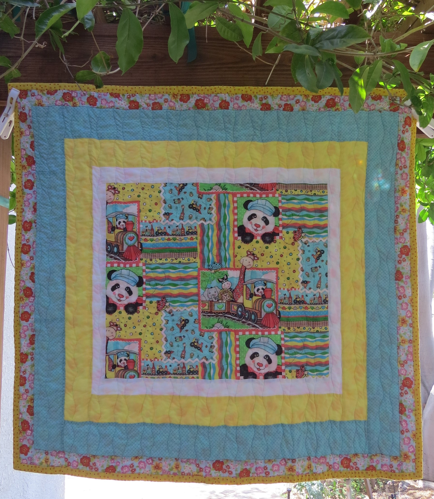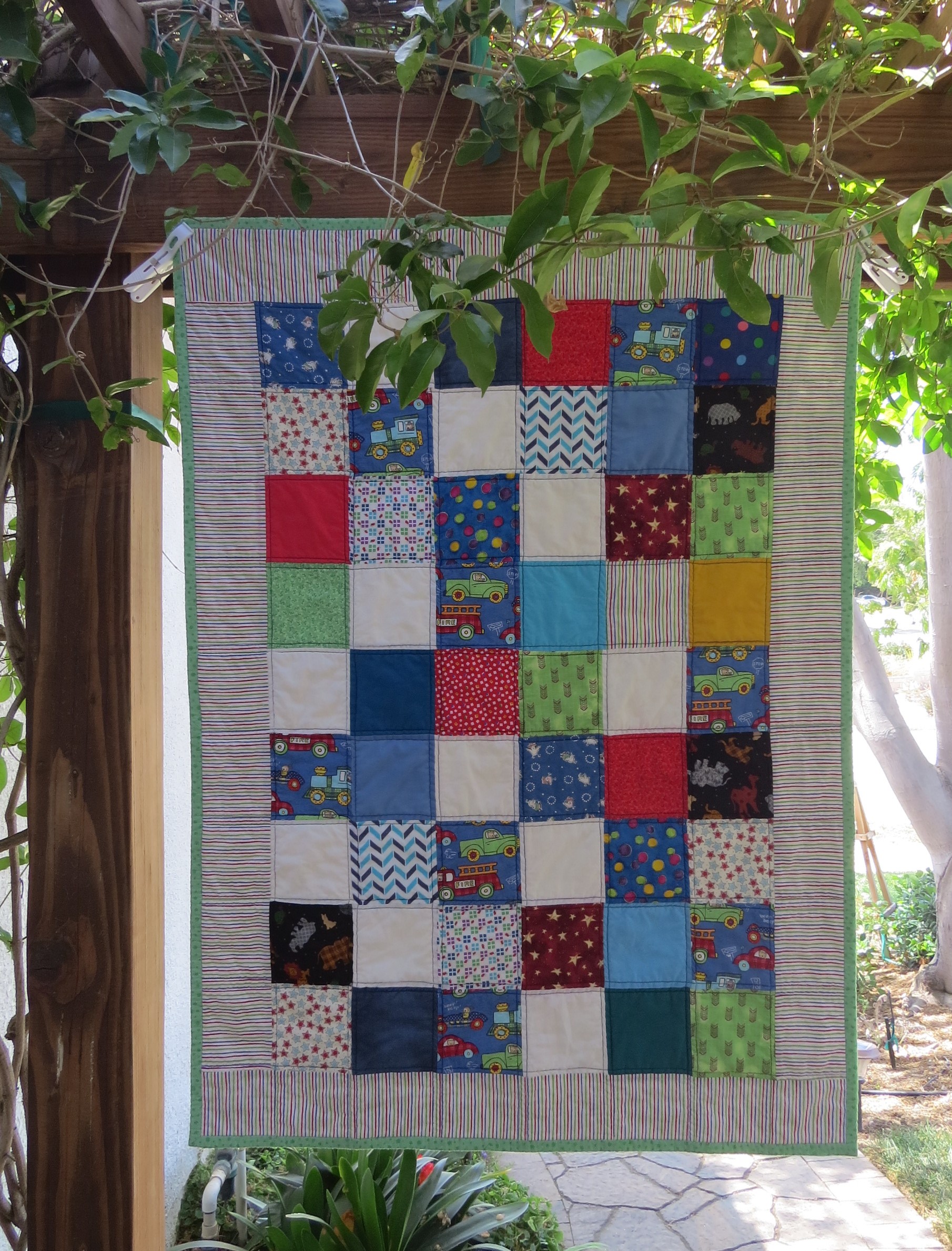 Here are four baby quilts that were designed and pieced by Jocelyn over at Happy Cottage Quilter. She had made these as part of this year’s Hands to Help Challenge, but had sustained a shoulder injury before she was able to quilt and bind them. She reached out to me to ask if I would like to finish them, which I did! I really enjoy quilting baby quilts, as they are a great way to practice and improve my quilting techniques. For Polka Party 1, I quilted straight lines, a 1/4″ on both sides of the seam lines. Polka Party 2 is quilted in large, overlapping circles. The third is quilted in a harlequin/diamond pattern, and Polka Party 4 is quilted in hourglass/wavy lines.