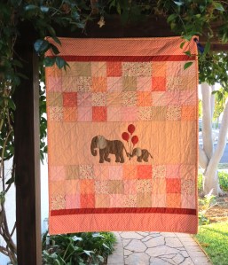 I’ve had an elephant applique on my list of ‘things to do at some point’, and couldn’t resist taking advantage of the alliteration of new baby Allie’s name with Elephants, aka Ellies. The colorway was based on the colors Mom and Dad had at the baby shower. The fabrics were pulled from my stash, a bit from my scraps boxes, and I purchased a few new fabrics to get the colorway just right.