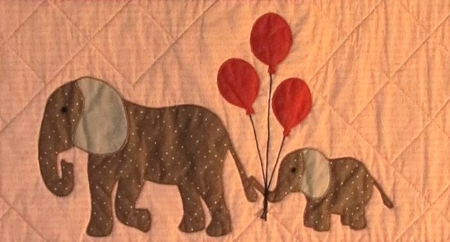 I’ve had an elephant applique on my list of ‘things to do at some point’, and couldn’t resist taking advantage of the alliteration of new baby Allie’s name with Elephants, aka Ellies. The colorway was based on the colors Mom and Dad had at the baby shower. The fabrics were pulled from my stash, a bit from my scraps boxes, and I purchased a few new fabrics to get the colorway just right.