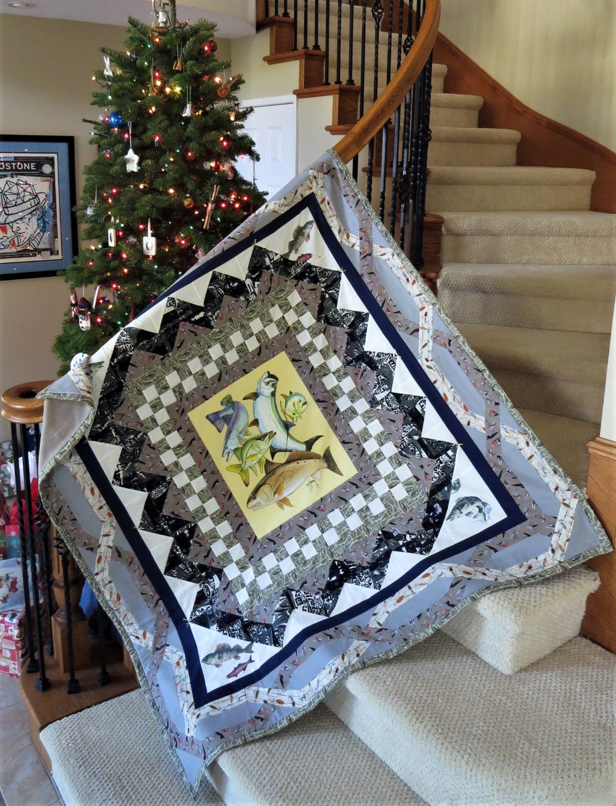 I chose to do this as a medallion quilt. The center fish design was from a tee-shirt, while most of the remaining fabrics were from three of Hide’s casual dress shirts. The fish in the four corners of the fourth border were from his pillowcase. I purchased the cream, dark blue and grey fabric to provide contrast to all the printed fabrics, and I also purchased the fishing lure fabric (in beige) to complement the fishing lure fabric taken from one of the shirts. In my final border, I wound these two fishing lure fabrics to represent Hide and Ryan: it is meant to be symbolic of how a parent and child’s life travel along separate paths, but always intersect, staying connected throughout life’s journey.